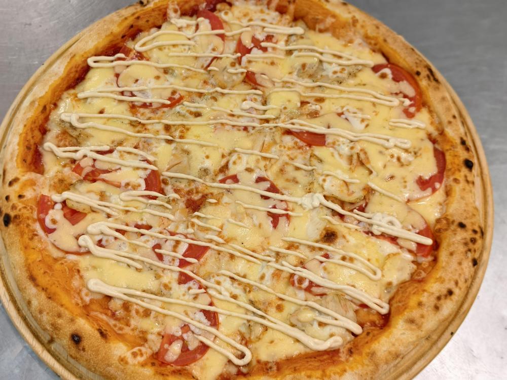 Соус фирменный, куриное филе, помидоры, соус цезарь, сыр моцарелла, сыр гауда.