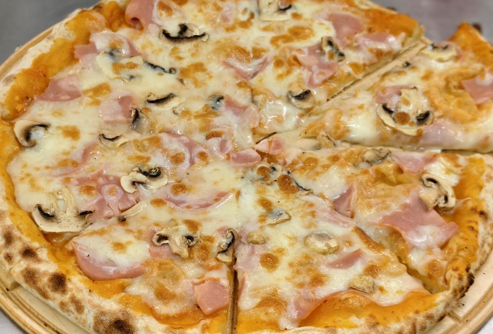 Тесто фирменное, соус красный, сыр моцарелла, сыр гауда, ветчина, грибы.