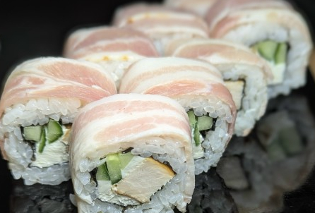 Состав: Рис, нори, сливочный сыр, огурец, курица обжаренная терияки, бекон