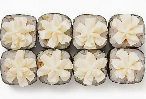 Рис, нори, сливочный сыр, лосось, снежный краб, белый кунжут.