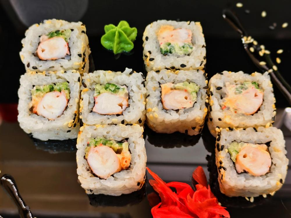Лосось, риет из краба, свежий огурец, сладкий чили, соус яки, рис, нори.