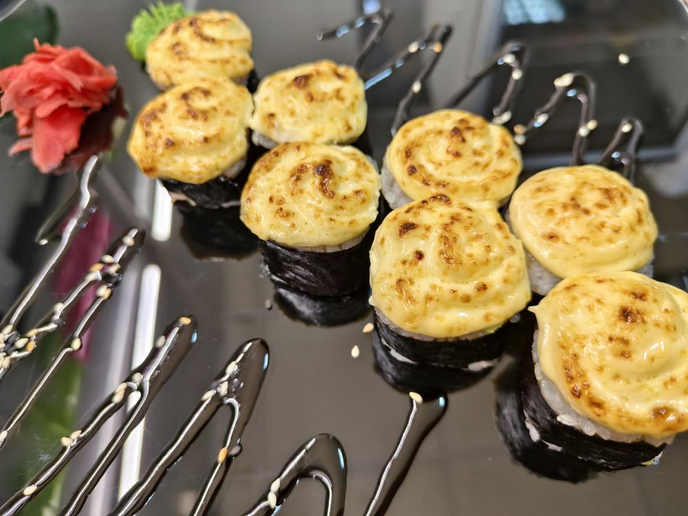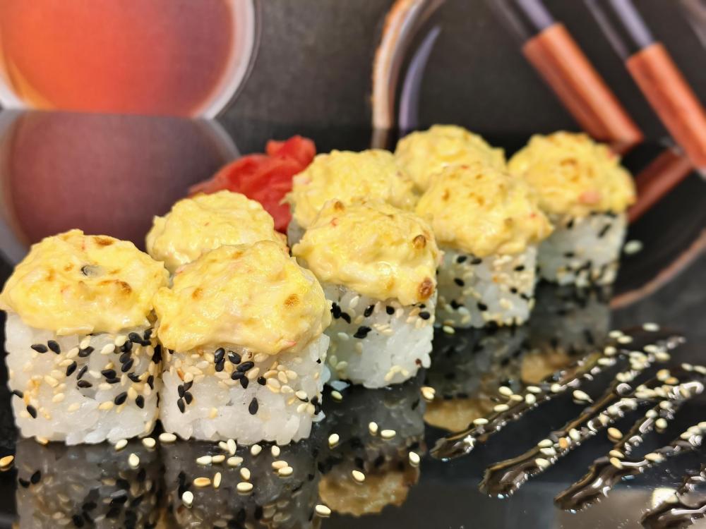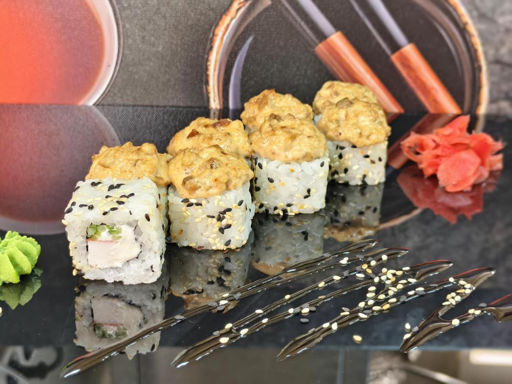 Японский омлет, свежий огурчик, сливочный сыр, лук кранч, сухари панко, рис, нори.