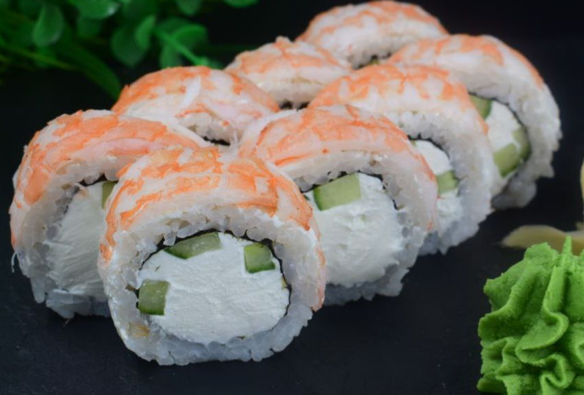 рис,нори,сливочный сыр,огурец,креветка сверху.