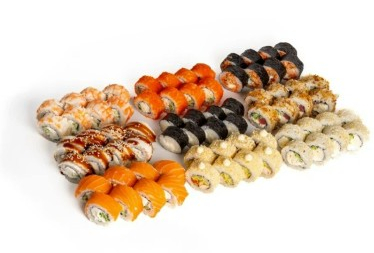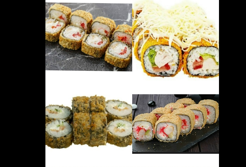 Сливочный с лососем темпура, Чикен темпура, запеченный Унаги-ролл, саламандр, Филадельфия классик, Калифорния VIP, Канадский, сливочный снежный краб, маки с креветкой.