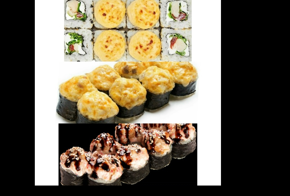 запеченный с мидиями ролл, запеченный унаги ролл, запеченная филадельфия